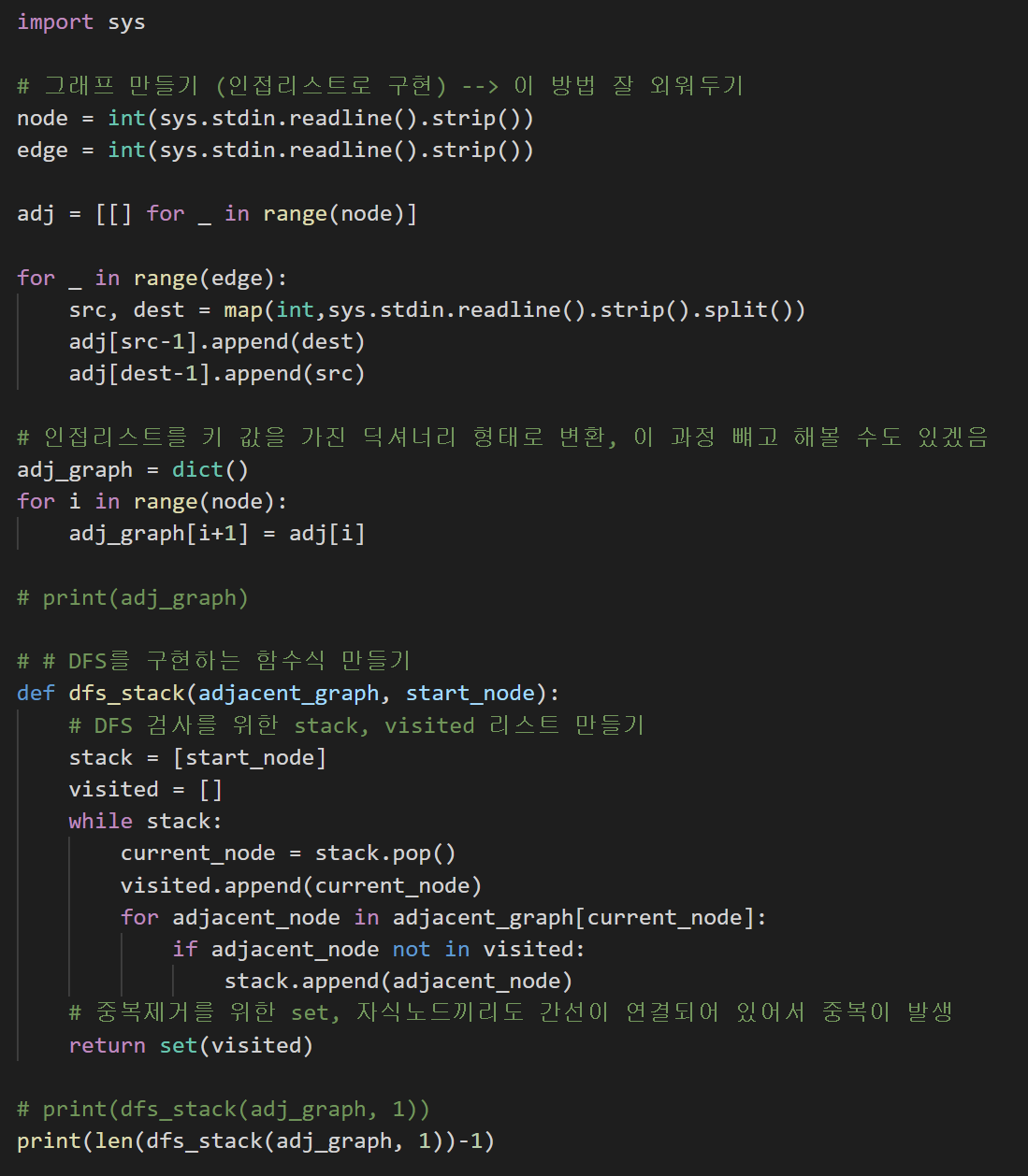 파이썬 언어: 인접리스트는 딕셔너리, Stack은 리스트 형태로 구현