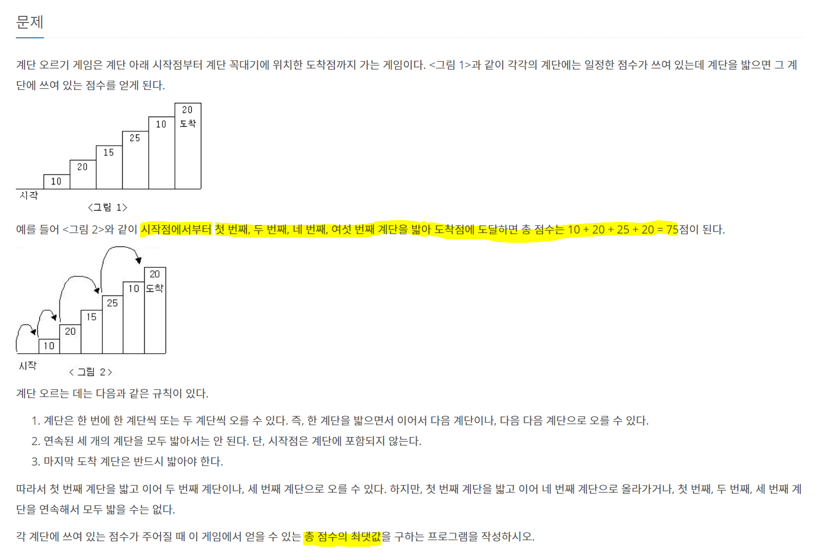 계단 오르기 게임은 계단 아래 시작점부터 계단 꼭대기에 위치한 도착점까지 가는 게임이다. <그림 1>과 같이 각각의 계단에는 일정한 점수가 쓰여 있는데 계단을 밟으면 그 계단에 쓰여 있는 점