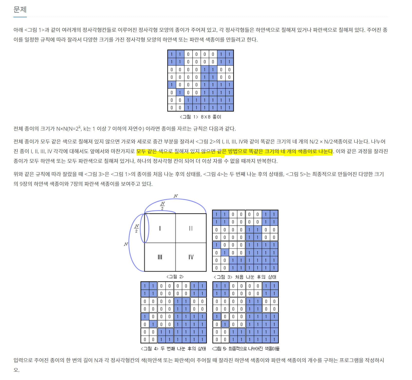 첫째 줄에는 전체 종이의 한 변의 길이 N이 주어져 있다. N은 2, 4, 8, 16, 32, 64, 128 중 하나이다. 색종이의 각 가로줄의 정사각형칸들의 색이 윗줄부터 차례로 둘째 줄부터 마지막 줄까지 주어진다.