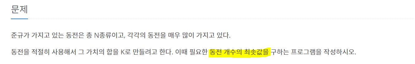 최적해 알고리즘 문제의 공통적인 특징 : 문제에서 상황을 던져주고 '최솟값', '최댓값'을 찾기를 요구한다. 이 문제 역시 동전 개수의 최솟값을 묻고 있다.